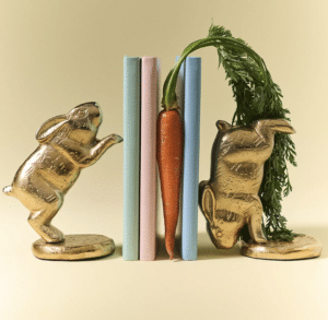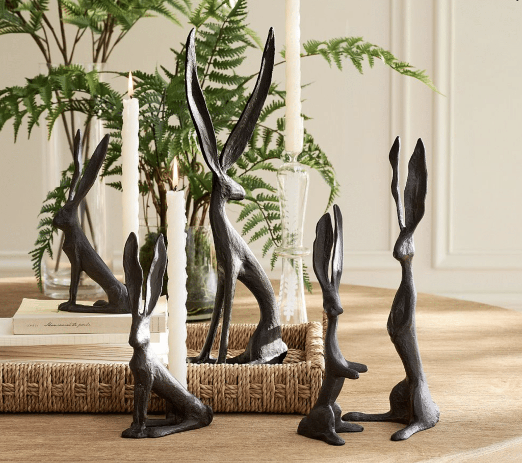 Stone bunny figurines or ceramic rabbits add a seasonal nod while still feeling timeless. Place them on bookshelves, console tables, or mantels. Keep spacing loose so everything feels intentional, not crowded.