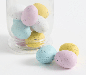 Display speckled eggs in a clear glass jar or bowl. This keeps the look clean and elevated. Stick to muted shades like blush, sage, soft blue, and cream for a cohesive palette.
